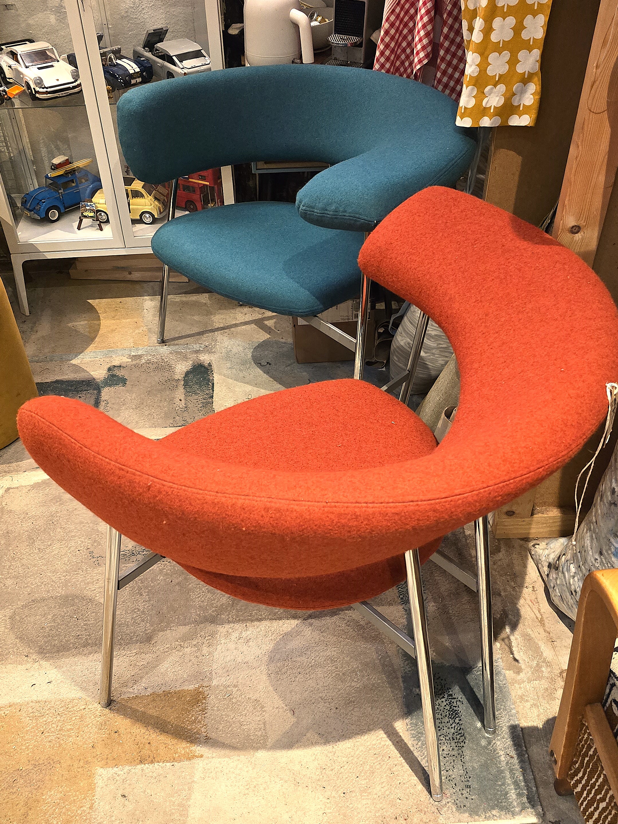 Twee Divi Divi design fauteuils Linker en rechter fauteuil, ontworpen door Mark van Tilburg voor Leolux jaren 80. asymmetrisch van vorm met een schitterend design. Set prijs €1500,-